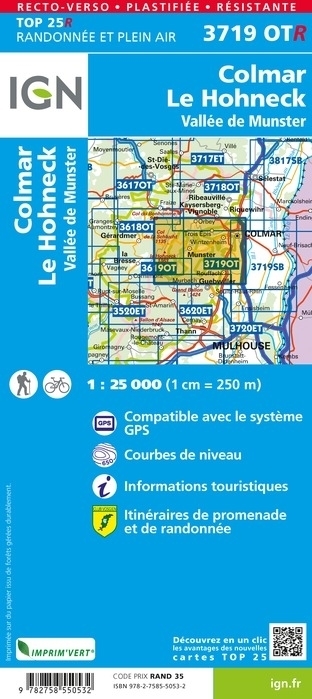L'indispensable carte de randonnée IGN 3719OTR imprimée en recto-verso aux alentours de Colmar, le Hohneck et la vallée de Munster. A conserver dans son sac à dos.