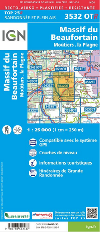 L'indispensable carte de randonnée IGN 3532OTR imprimée en recto-verso aux alentours du Beaufortain, de Moûtiers et de La Plagne. A conserver dans son sac à dos.