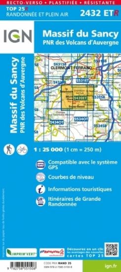 L'indispensable carte de randonnée IGN 2432ETR. D'une très grande précision elle contient tous les détails existants sur le terrain : voies de communication jusqu'au moindre sentier, constructions jusqu'au hangar, bois, arbre isolé, rivière, source... Sans oublier la représentation du relief par des courbes de niveau. Les sentiers balisés et les informations touristiques sont également représentées.