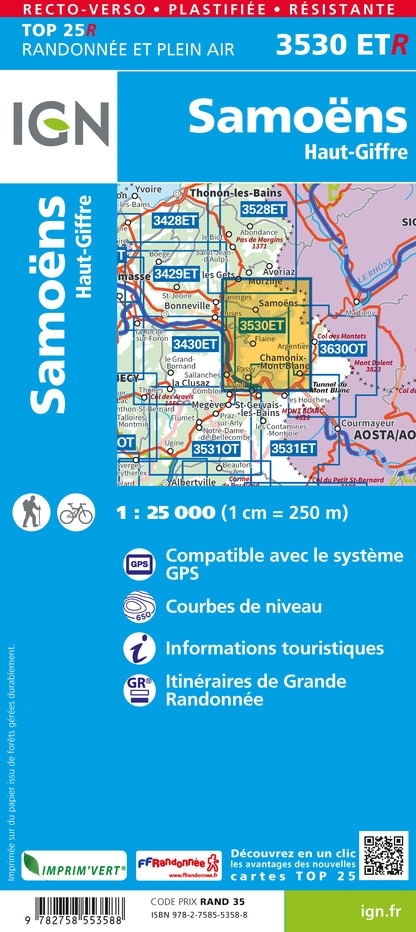 L'indispensable carte de randonnée IGN 3530ETR, imprimée en recto-verso, aux alentours de Samoëns, Chamonix et du massif du Mont Blanc. A conserver dans son sac à dos.