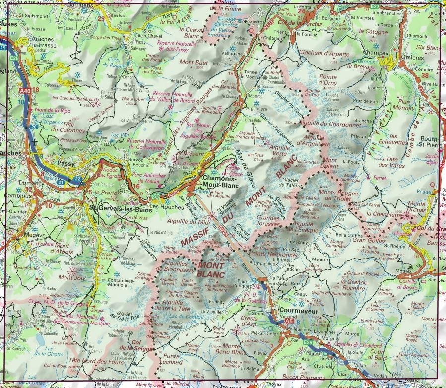 - les courbes de niveau, les points cotés, les zones rocheuses et les glaciers pour estimer la difficulté,