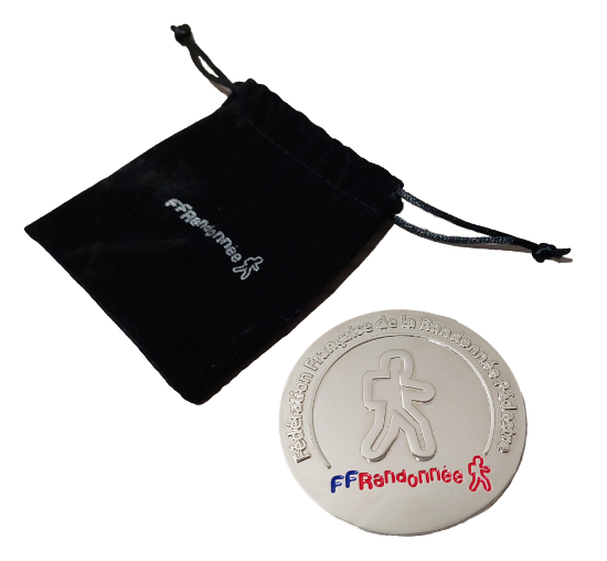 Médaille livrée dans un pochon en suédine noire siglé FFRandonnée