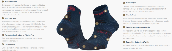 La chaussette est composée de zones de renforts à l’avant du pied et sous le talon pour protéger le pied efficacement lors des efforts.