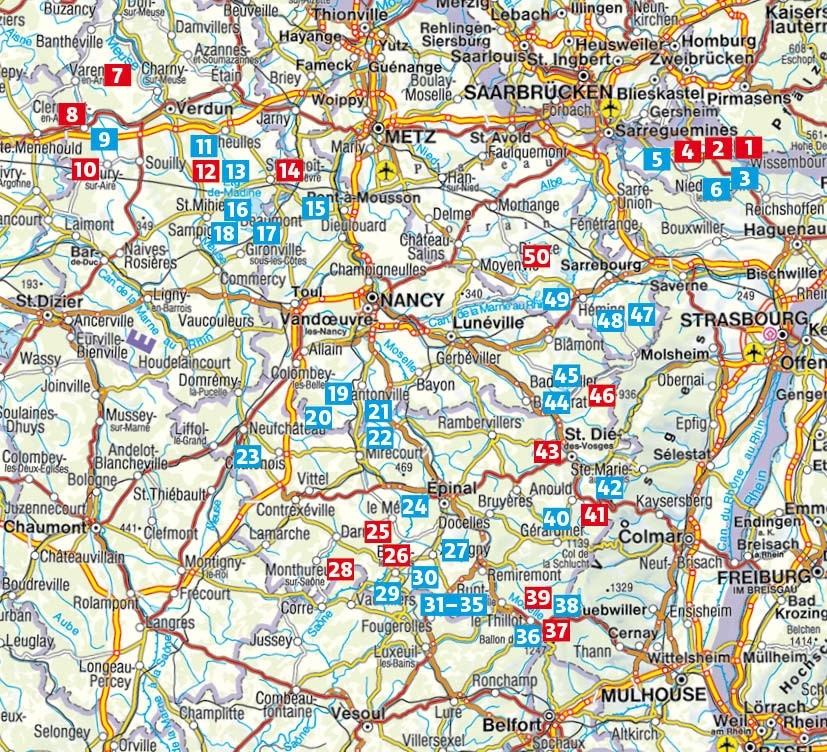 La sélection d'itinéraires comprend des circuits dans le Parc naturel régional des Ballons des Vosges, le Parc naturel régional des Vosges du Nord et le Parc naturel régional de Lorraine ainsi qu'aux alentours du magnifique Lac de Madine.