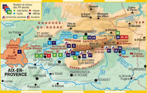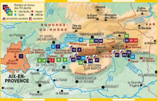 Caillou "usé" cher au peintre Cézanne, le blanc massif calcaire de la Sainte-Victoire est un élément symbolique de la Provence et un terrain d'évolution très convoité pour les loisirs de plein air. Labellisé "Grand Site de France" et "Site natura 2000", cette montagne a vu la mise en place de politiques de conservation d'espèces rares, en particulier des chauves-souris, reptiles et amphibiens. Trois milieux naturels caractérisent le massif : pelouse, garrigue et bois de chênes verts.En fonction des saisons, le randonneur pourra reconnaître quelques espèces courantes : iris, ciste cotonneux, lys martagon, ophrys de Provence... Parmi les circuits proposés, les marcheurs ne manqueront pas de grimper jusqu'à la Croix de Provence (point culminant à 946 m) ou de découvrir en famille l'étonnant site de Roques-Hautes, l'un des plus riches gisements d'oeufs de dinosaures au monde.