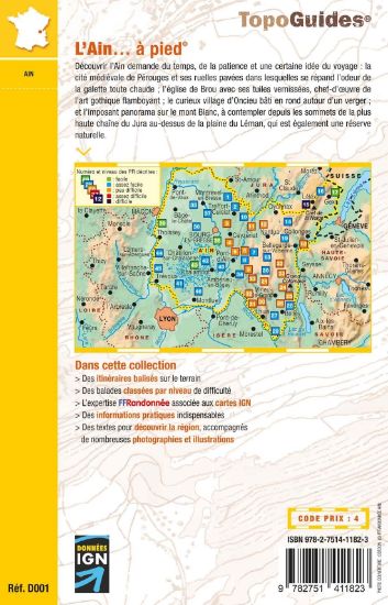 Découvrir l'Ain demande du temps, de la patience et une certaine idée du voyage : la cité médiévale de Pérouges et ses ruelles pavées dans lesquelles se répand l'odeur de la galette toute chaude ; l'église de Brou avec ses tuiles vernissées, chef d'oeuvre de l'art gothique flamboyant ; le curieux village d'Oncieu bâti en rond autour d'un verger et l'imposant panorama sur le Mont-Blanc, à contempler depuis les sommets de la plus haute chaîne du Jura au-dessus de la plaine du Léman, qui est également une réserve naturelle.Ces 46 circuits satisferont aussi bien les randonneurs sportifs, qui pourront gravir les 1 710 m du Crêt de la Neige que les amateurs de promenades bucoliques qui apprécieront la fraîcheur des étangs de la Bresse.