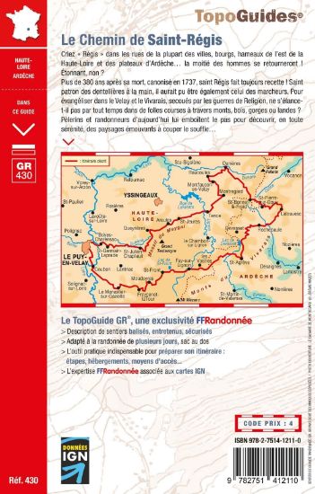 Saint patron des dentellières à la main, Régis aurait pu être également celui des randonneurs pédestres. Pour évangéliser dans les contrées du Velay et du Vivarais secouées par les Guerres de Religion, ne s'élancait-il pas par tous temps dans de folles courses de 40 à 60 km à travers monts, bois, gorges et landes ? Pèlerins et marcheurs d'aujourd'hui lui emboîtent le pas pour découvrir, en toute sérénité, des paysages émouvants à couper le souffle.