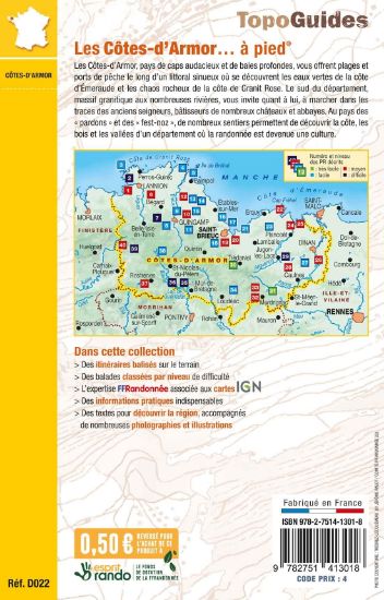 Les Côtes-d'Armor, pays de caps audacieux et de baies profondes, vous offrent plages et ports de pêche le long d'un littoral sinueux où se découvrent les eaux vertes de la côte d'Émeraude et les chaos rocheux de la côte de Granit Rose. Le sud du département, massif granitique aux nombreuses rivières, vous invite, quant à lui, à marcher dans les traces des anciens seigneurs bâtisseurs de nombreux châteaux et abbayes. Au pays des pardons et des fest-noz, de nombreux sentiers permettent de découvrir la côte,les bois et les vallées d'un département où la randonnée est devenue une culture.