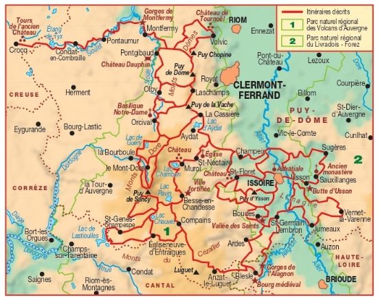 Aux portes de Clermont-Ferrand, dominant les gorges de la Sioule, la chaîne des Puys étire les cônes et cratères de ses 80 volcans aux formes arrondies, véritables musées à ciel ouvert des formations volcaniques : Puy Chopine, Puy de Dôme, Puy de l'Angle, Puy de Sancy. Plus au sud, cadeaux des glaciers, des lacs aux eaux sombres et froides abritent une faune et une flore curieuses. Enfin, à l'Est, dominé par le joyau roman qu'est l'abbatiale d'Issoire, le val d'Allier offre ses nombreux châteaux et forteresses médiévales.Autour d'issoire, le GR® de Pays du val d'Allier, propose 5 boucles de 3 à 5 jours.